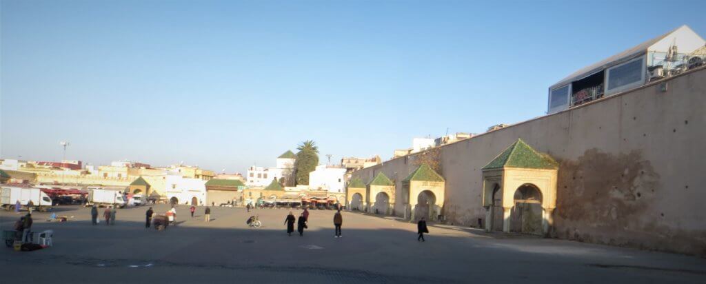 Vrlo brzo dolazi vodič koji predlaže da razgled započnemo s medinom te se tako šećemo do trga Place el Hedim – analogonu svjetski poznatom trgu Djemaa El Fna u Marakešu. Rano je prije podne i na trgu tek započinje život, no sasvim dovoljno da se može osjetiti autentična vibra Maroka no ni blizu kaosu na koji ću naići u Marakešu. Trgom dominiraju monumentalna vrata u područje kraljevskog grada koja se zovu Bab Mansur i možda su najvjerodostojniji svjedok njegova nekadašnjeg značaja.